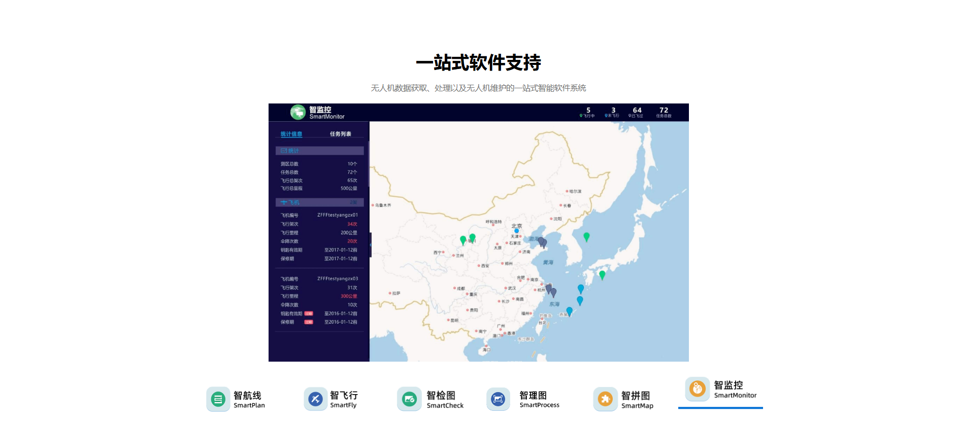 P300配备的"无人机管家"地面站软件具有丰富的可见光/热红外视频实时监视功能,支持从精准三维航线规划、三维实时飞行监视与控制、目标智能跟踪及持续监视、实时测算目标位置坐标,到飞行数据存储及可视化回放等全流程作业所需功能,其兴趣点环绕飞行模式还可对目标进行持续定点监视。通过飞马云还可实现机队任务统一规划及分配执行、飞行作业远程实况云播、权限管控及一系列主动式服务。